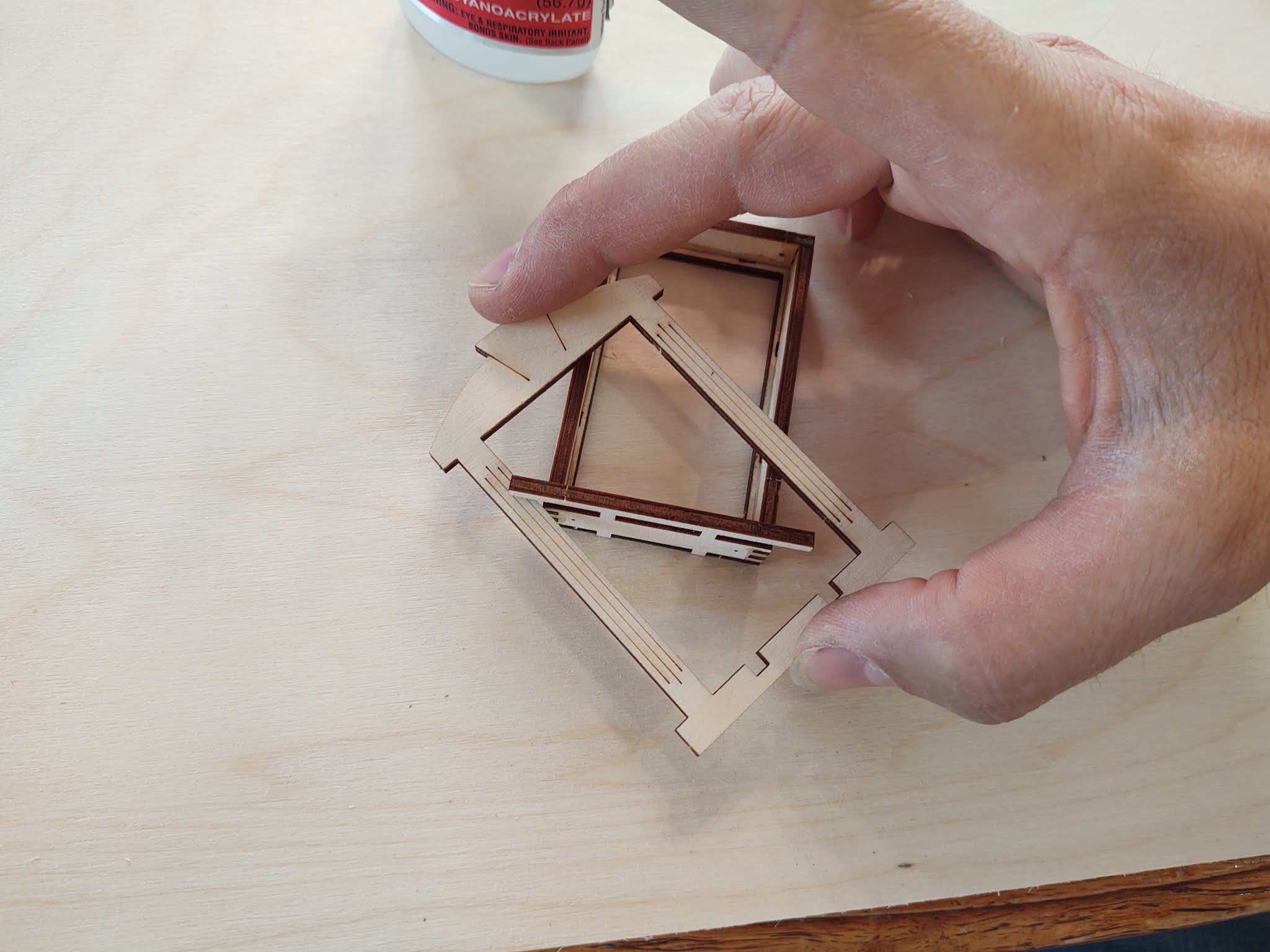 Add glue (we use CA Glue) to the inside corner, at each corner, making sure to contact the 2 edge pieces and the bottom (back) piece. You don't need much. This is just to hold it in place for now. Once glued, be sure to hold the frame tight together and square, as well as down to the back piece. (but don't glue it to your workbench!)